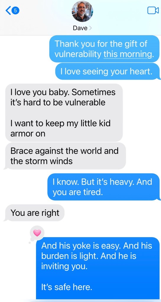 This text (shared with permission), is an example of new-Dave—being vulnerable with his wife. Harry Pottress calls this “being naked”. “Being naked” is a throwback to the Garden of Eden and how original sin made Adam and Eve want to hide from God. But being made in God’s image means that we were built with longings…for connection and impact. And the trick is to share those longings with each other without trying to hide them or cover them up.